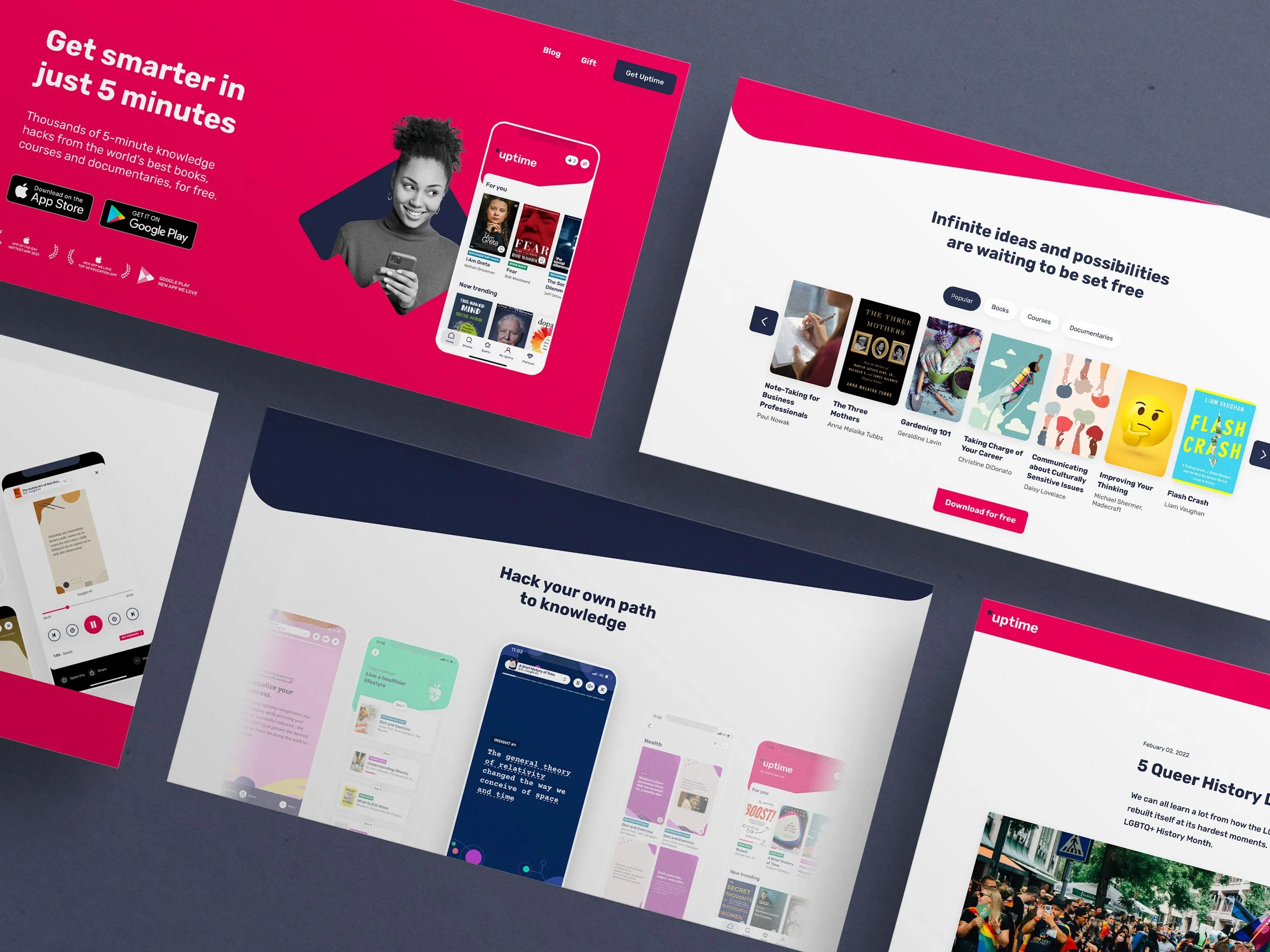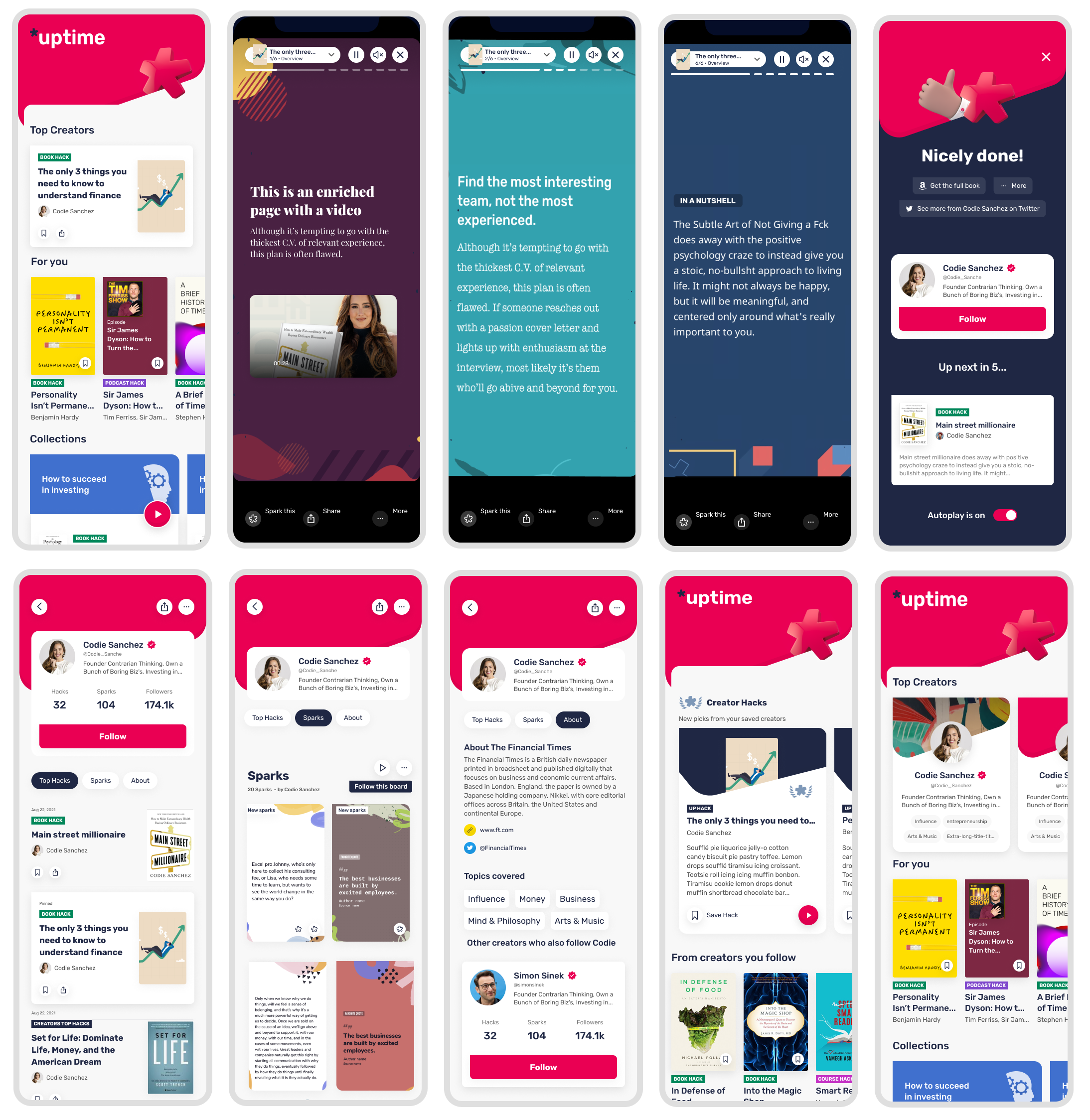 Uptime transforms books, courses, and documentaries into 5-minute Knowledge Hacks. I worked on designing user flows and content layouts that boosted engagement, creating space for both readers and creators to connect more meaningfully with the platform.